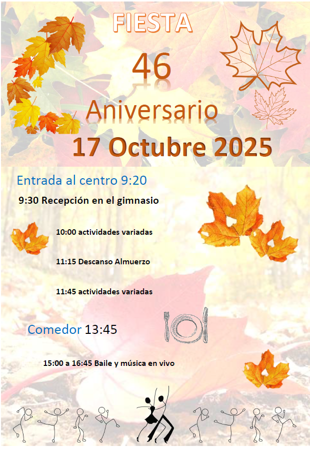 El viernes 17 de octubre, celebramos nuestro 46 Aniversario, realizaremos diversas actividades y por la tarde baile.